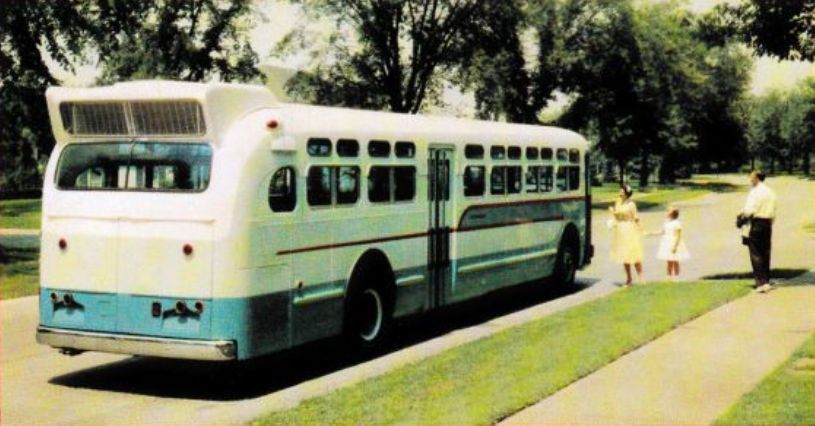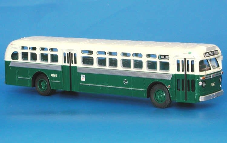 The bus is a GMC TDH-5502, a model only CMC had. It has wide front door and four pairs of windows between the doors. |