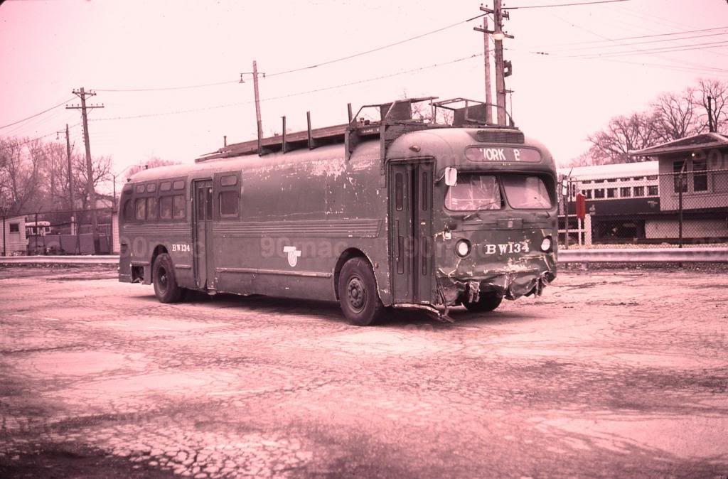 In a shot taken at a Chicago Transit Authority (CTA) property (date unknown) we see fleet number BW 134 - a 51 passenger 1950 or 1951 GM Coach Model TDH 5103 and one of 100 originally purchased by the Chicago Motor Coach Company (CMC) but acquired by CTA in 1952 as part of its takeover of that company.