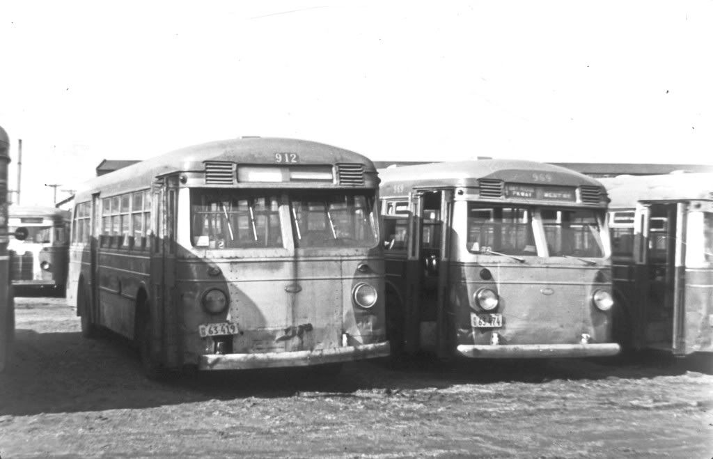 The two interesting buses pictured (912 and 969) in city garb were 1939 Mack model 'Improved' CT-3G's (the improvement being the angled windshields) and were originally part of a seventy-five bus order numbered 900 to 974 for the Brooklyn Bus Corporation of Brooklyn, New York.